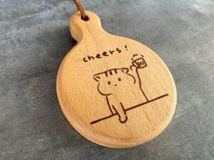 產品介紹:這款「客製實木開瓶器」以天然山毛櫸木精製,手感溫潤細膩,搭配雷射雕刻呈現舉杯貓咪的可愛插畫,文字「cheers!」增添歡樂氛圍,成為送禮或居家小物的療