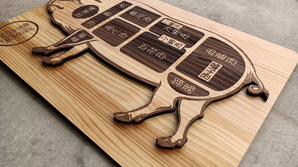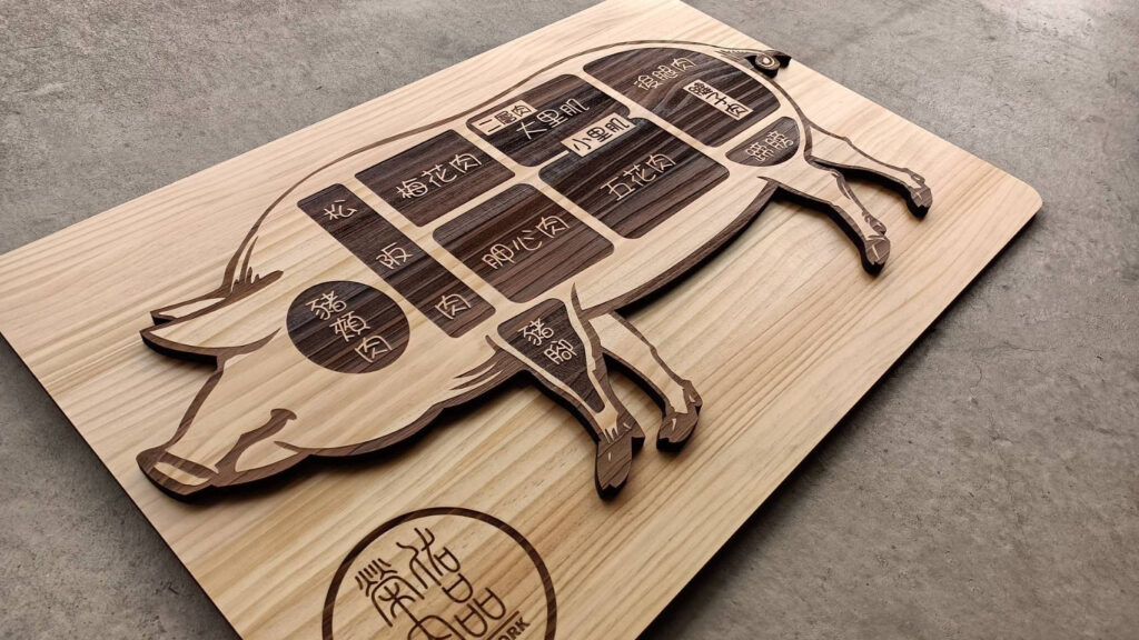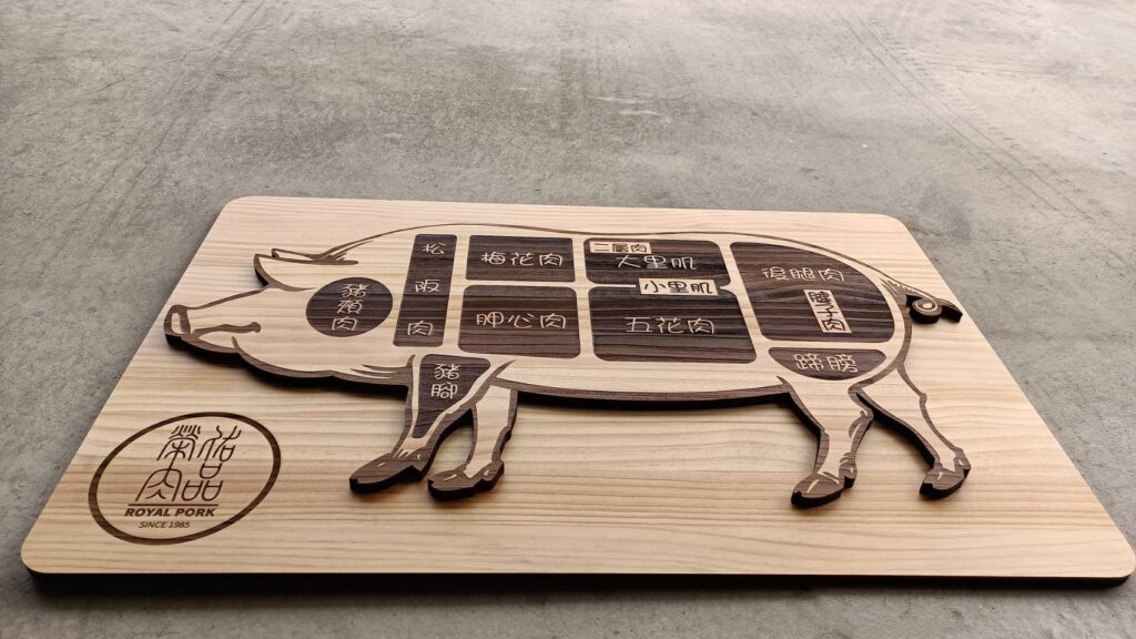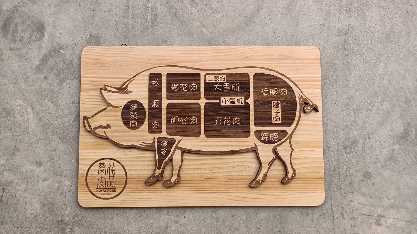 發佈於 16 6 月, 202516 6 月, 2025豬肉部位標示木招牌(雷射雕刻) 產品介紹:這款為客戶量身製作的豬肉部位標示木招牌,選用厚實的松木製成,整體以雷射雕刻工藝精細呈現豬隻各部位分區與名稱。豬隻輪廓立體層次分明,搭配深淺木紋對比,讓每一個部位標示清楚易辨識,兼具實用與美觀。非常適合用於肉品專門店、攤位佈置或品牌展示,提升專業形象之餘,也讓消費者對產品來源一目了然。尺寸:88X58cm加工方式:雷射雕刻材質:松木12mm